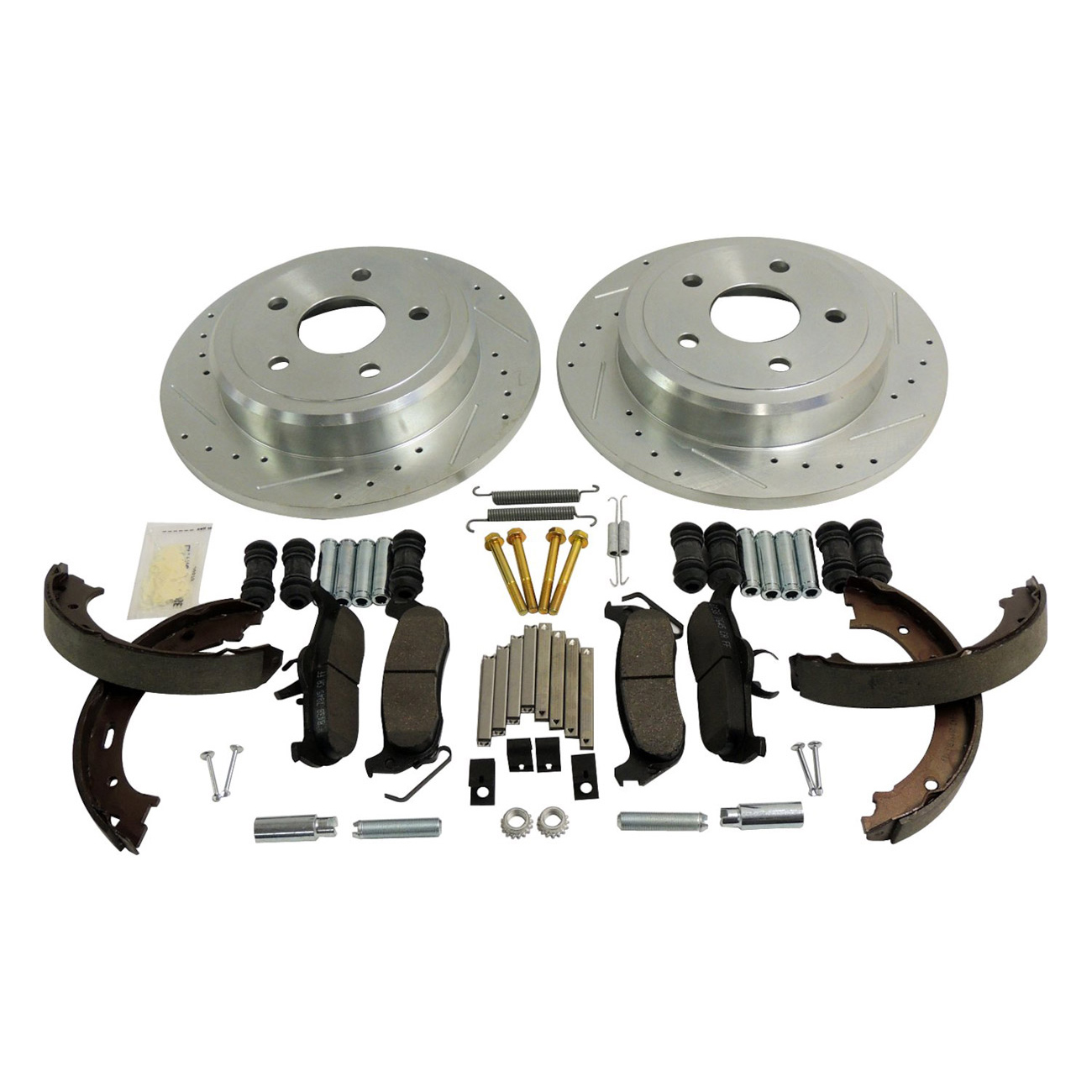 Complete Performance rear Brake kit including 2 drilled & slotted Rotors, Pad Set, Parking Brake Shoes and all Hardware. A keresztbe fúrt lyukak és a megmunkált hornyok maximális hűtést biztosítanak a fékbetéteknek és a forgórésznek, segítve a fékfakadás kiküszöbölését. A jobb hőelvezetés csökkenti a rotor deformálódásának valószínűségét. Úgy tervezték őket, hogy gyorsan kiszorítsák a súrlódó gázokat, szennyeződéseket és vizet, hogy növeljék a fékek reakcióját és teljesítményét. A sportos megjelenés a keményen dolgozó forgórészek bónusza.